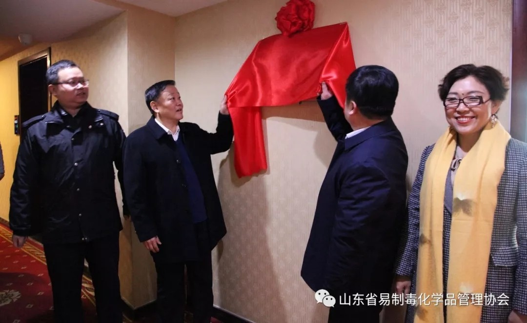 最后,由市禁毒委副主任、市禁毒办主任、市公安局党委委员、警察学校政委赵兰生,省公安厅禁毒总队三支队支队长张功明,省易制毒化学品管理协会会长单位负责同志、鲁西化工集团股份有限公司副总经理金同营,省易制毒化学品管理协会秘书长马少燕共同为省易制毒化学品管理协会聊城办事处揭牌。